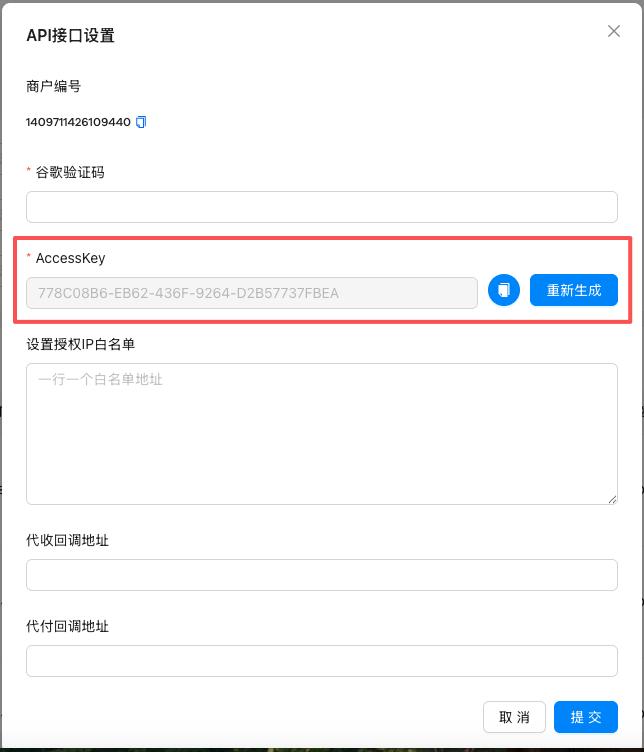 ## 二、设置AccessKey <a href="#er-pei-zhi-hui-tiao-di-zhi" id="er-pei-zhi-hui-tiao-di-zhi"></a>